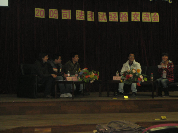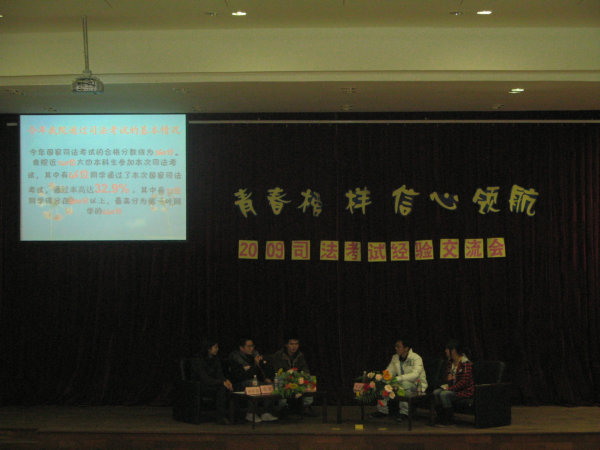 今年法学院大四共有46人通过考试,这对其他年级在校生是极大鼓舞。为了提高同学们备战司考的信心和应对司考的能力,11月30 日晚,法学院在模拟法庭举办2009年司法考试经验交流会,邀请今年刚通过司考的四位同学——施海燕、张骞、李亚东、郑林担任嘉宾,与学院立志来年司考的同学一起分享他们司考路上的酸甜苦辣与成功的喜悦。四位同学对大一、大二的同学指出,若有意司考,可提早做好相关知识的学习和储备,而对于备战司考的大三同学,他们则重点推荐了一些对考试有帮助的名师、网站、复习资料等。他们还各自介绍了自己的复习备考方法。随着交流会的逐渐升温,他们毫无保留地向学弟学妹们介绍了在司考路上的点点滴滴。这些来自同学们身边的成功范例,使在座的每一位同学都深深感悟出了四个字——坚持、拼搏,正如施海燕同学所说“最关键的还是要靠自己”。