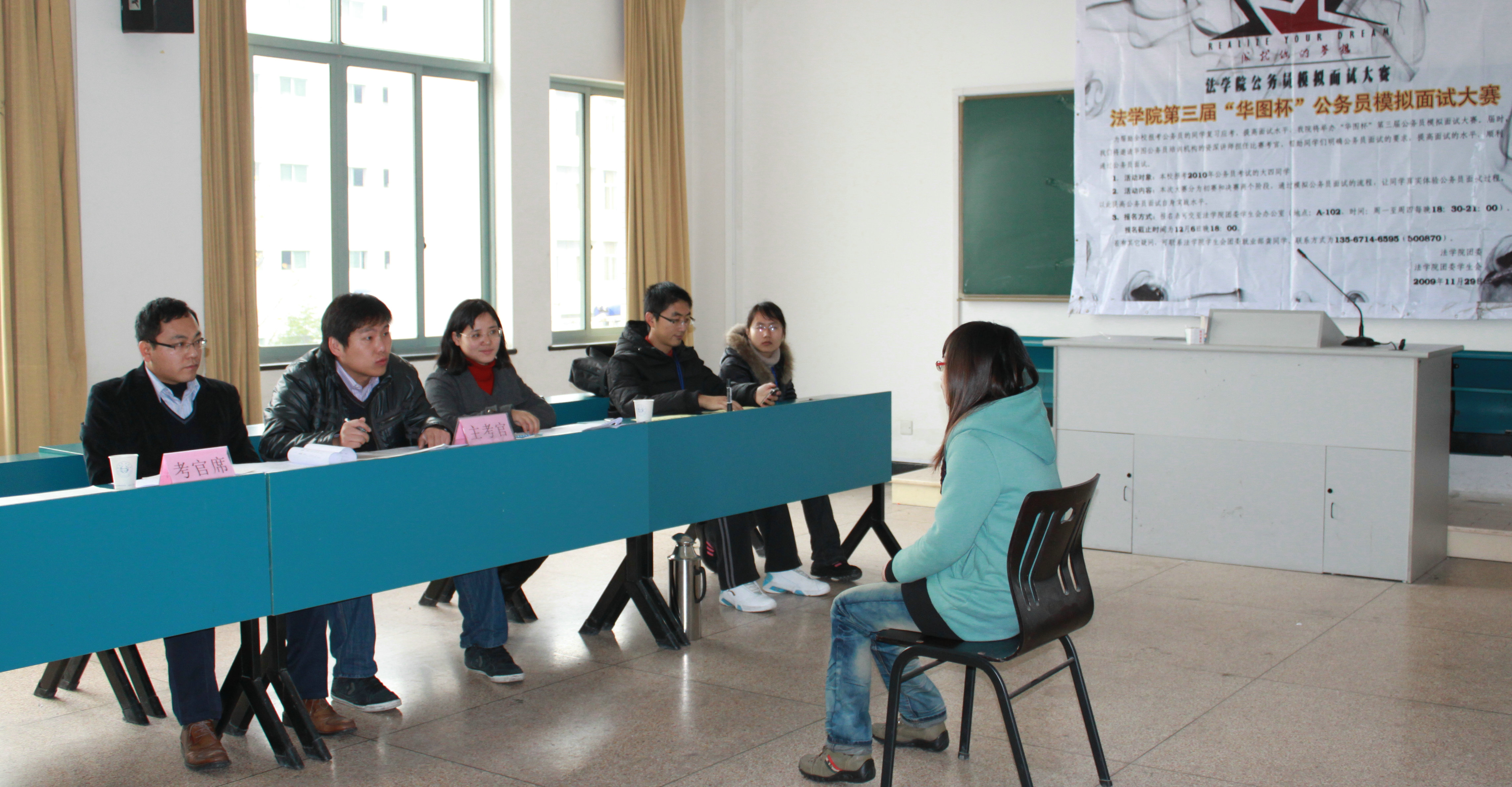 我院高度重视学生的就业工作,针对法学专业的特点,积极采取各种措施提升学生的就业能力。为了使报考公务员的同学进一步了解面试程序,掌握面试技巧,提升公务员考试的成功率, 法学院于12月9日下午举办第三届“华图杯”公务员模拟面试大赛,来自人文、卫管、理学和法学等学院的三十余名同学参与了初赛阶段的比赛。