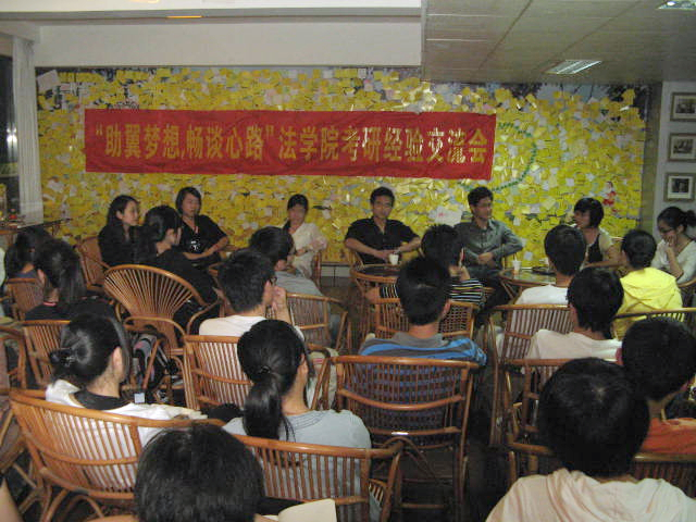 为了提升同学们对研究生考试的应考能力,提高我院研究生考试的通过率, 5月20日晚6点30分,名为“助翼梦想,畅谈新路”的法学院考研经验交流会在学生成长就业指导中心举行。本次交流会邀请到了今年考上研究生的郑林、金玮、卢璐、许慧菁、陶冬梅、张志远等6位同学,与到场的同学们进行了交流。