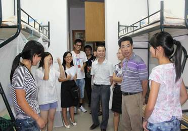 每到一个寝室,学院领导都亲切地询问每个新生的名字和家乡,入校感受、适应状况,军训准备情况等,并鼓励大家尽快适应新环境,投入到几天后艰苦快乐的军训生活中。期间,学院领导还特别走访了少数民族同学的寝室,现场询问了报到及入住情况,表示学院会尽最大的努力帮助其解决今后生活上可能出现的困难。学院领导提醒同学保管好自身财物,提高警惕,防盗防骗,注意交通治安防潮水等安全。团委老师希望大家积极关注最近校院活动安排,多多与老师和学长学姐交流,尽早融入大学生活。