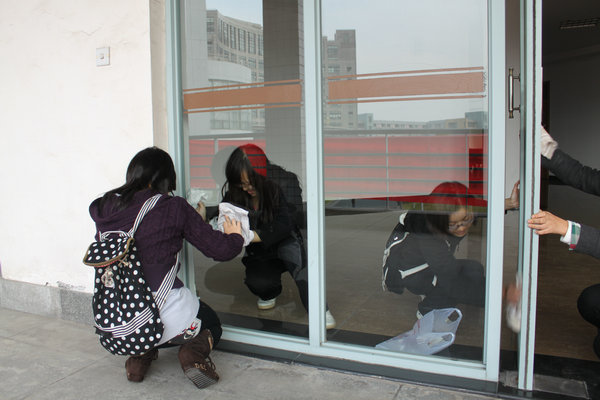 经过了简短而隆重的启动仪式后,各义工小组在组长的带领下分别奔赴各自的指定场地开展了第一次义工活动——清扫教室。各小组在各个教学楼层俯身拖扫,上窗擦洗,清理桌椅。大家互相配合,协力合作,在两个小时的义工活动中,教学楼在义工的擦洗下显得更清洁,更温馨。