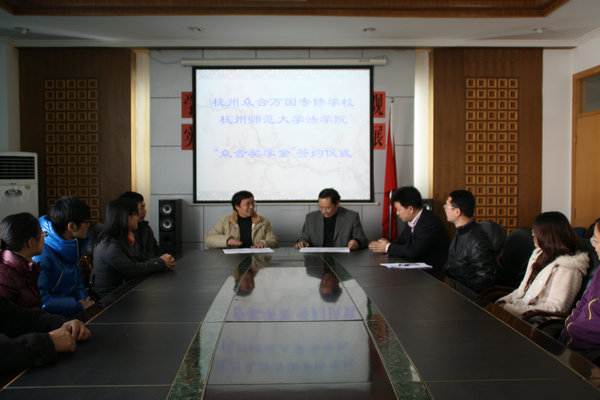 12月20日下午,与杭州众合万国专修学校正式签署协议。双方协议规定,众合万国专修学校赞助我院设立奖学金,每年出资二万元,奖励当年通过司法考试的本科学生,并视情确定合理比例每年递增金额追加奖学金赞助。此外还规定,众合万国专修学校为我院学生参加司法考试培训每年提供免费培训名额一名;向我院图书资料室赞助5套司法考试图书;为我院学生提供报酬较优厚的勤工俭学岗位;择优录用法学院优秀毕业生。