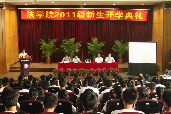 2011年9月5日上午10点,法学院2011级新生开学典礼在法学院模拟法庭举行。法学院院长罗思荣、党总支副书记唐钢、副院长朱炜、法治中国化研究中心主任范忠信教授出席了此次开学典礼。
