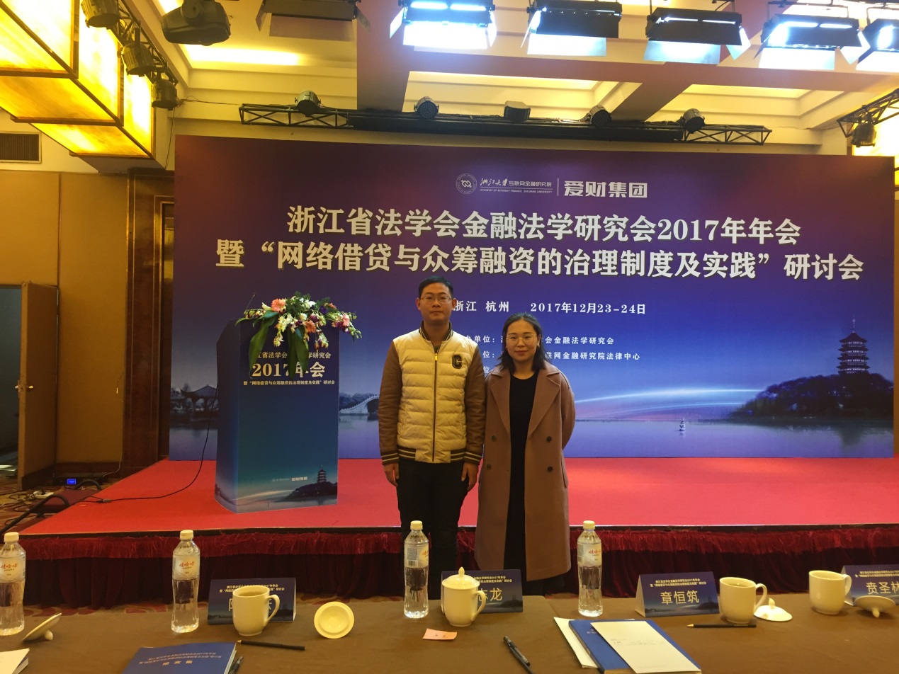 浙江省法学会金融法学研究会、浙江大学互联网金融研究院法律中心于2017年12月24日,在浙江大学紫金港国际饭店召开2017年年会研讨。我院经济法学专业研究生蒋文文、吴永星参加了浙江省法学会金融法学研究会2017年年会暨“网络借贷与众筹 融资的治理制度及实践”研讨会。参会论文《互联网校园贷法律风险及防范》获评一等奖。