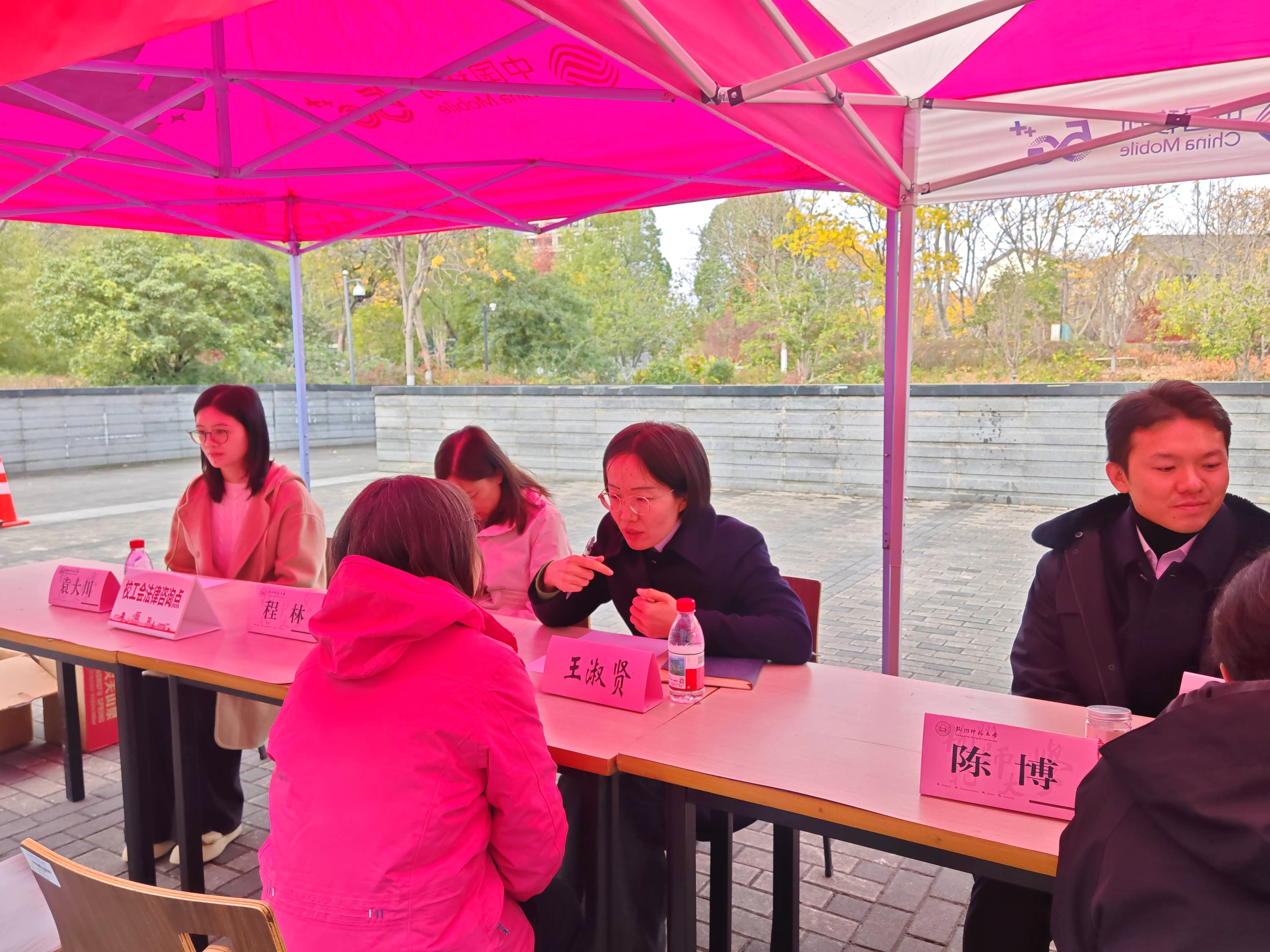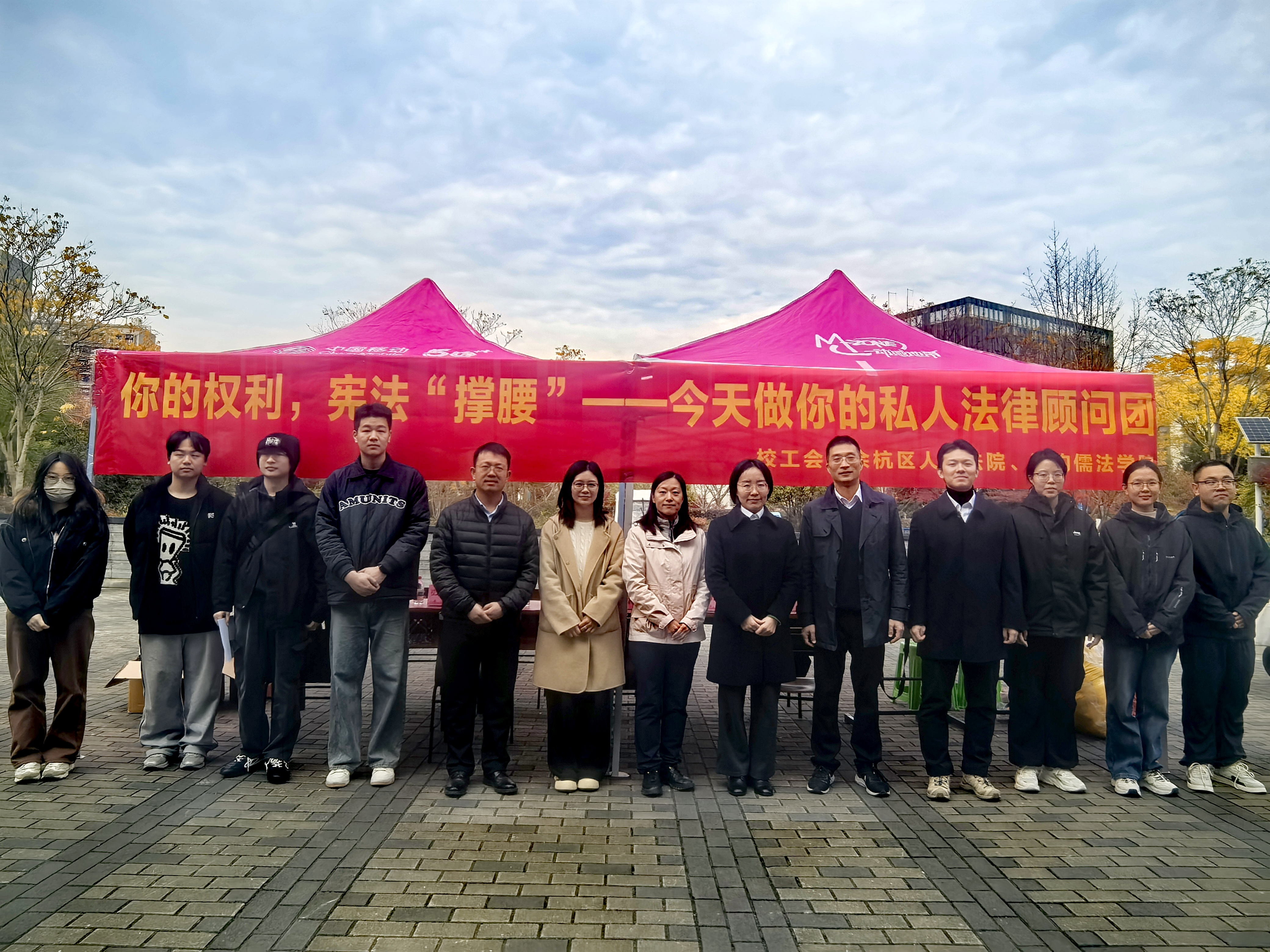 2025年12月4日,我院法硕中心联合余杭区人民法院、校工会法律咨询部共同组建专业顾问团,于杭州师范大学仓前校区开展“你的权利,宪法‘撑腰’——今天做你的私人法律顾问团”主题宣传活动。活动以“一对一”答疑解惑的形式,精准对接师生法律需求,有效打通法律条文与师生认知之间的衔接壁垒,让法治精神在互动交流中深入人心。
