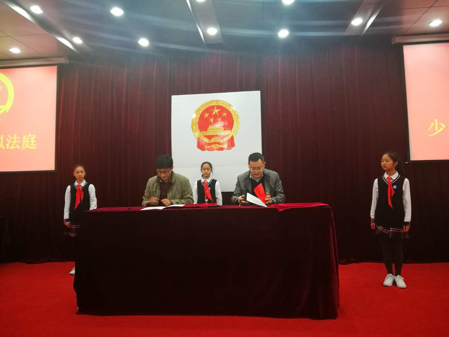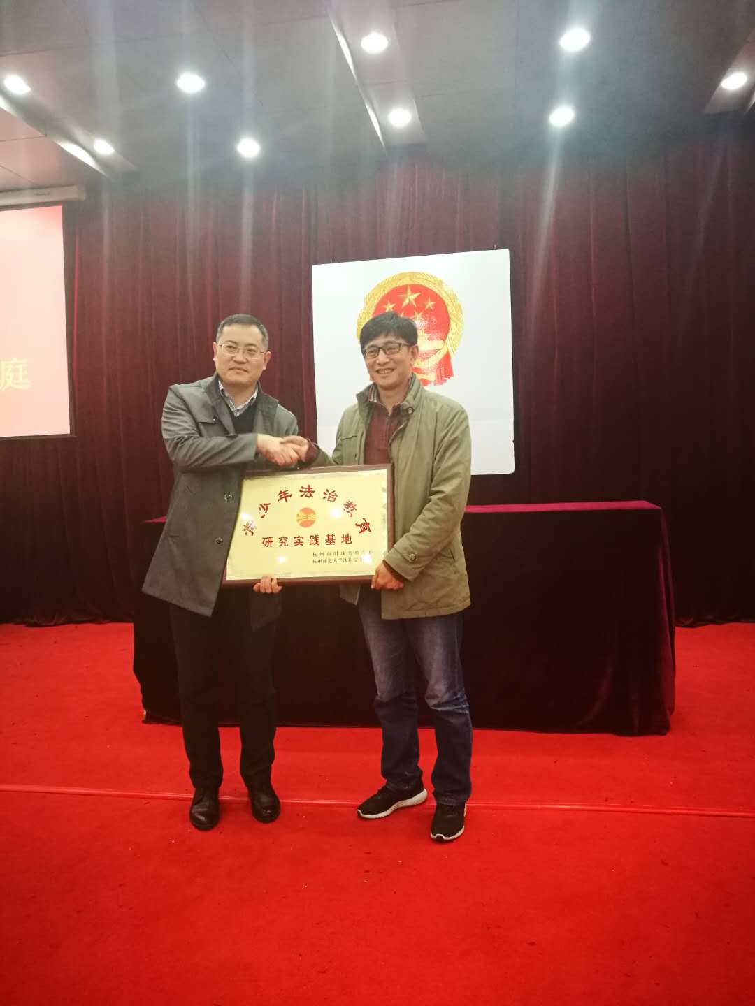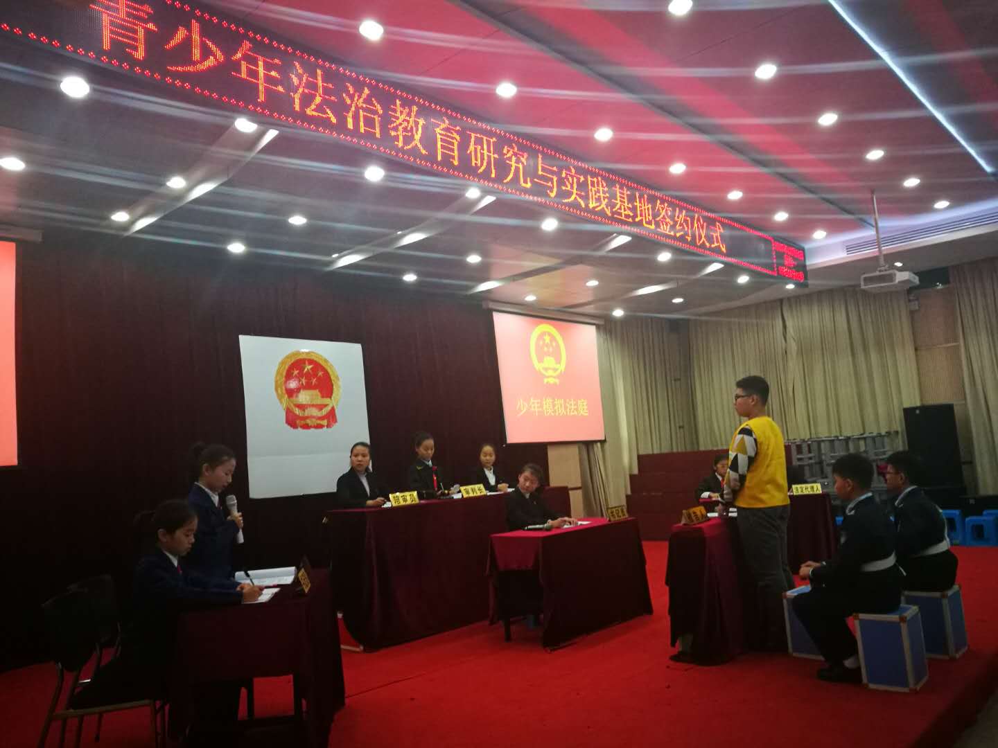 明珠实验学校的同学们在现场进行了精彩纷呈的少年模拟法庭的表演展示。杭州市明珠实验学校校长洪建斌和杭州师范大学沈钧儒法学院副院长赵元成分别代表双方签订了合作协议并予以授牌,标志着基地正式成立以及双方长期的合作的开始。